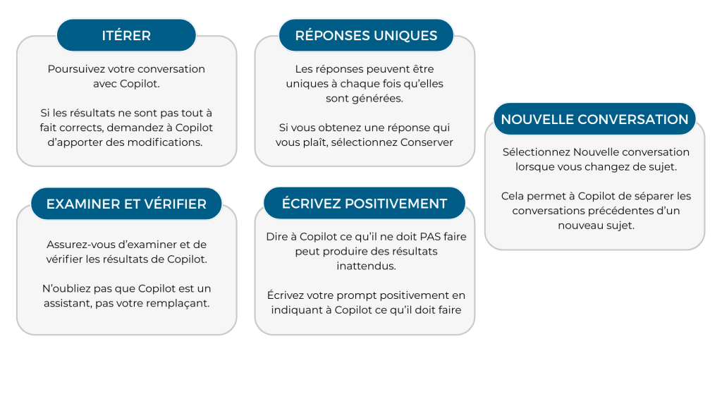 Comme tout outil puissant, Copilot nécessite un certain apprentissage pour être utilisé à son plein potentiel. La qualité des réponses qu’il fournit dépend directement de la manière dont les prompts sont rédigés.