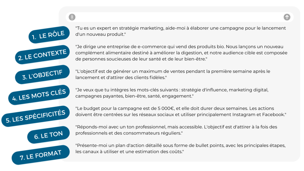 En précisant un rôle, vous orientez l’IA vers un cadre d’expertise spécifique et améliorez la qualité de sa réponse.